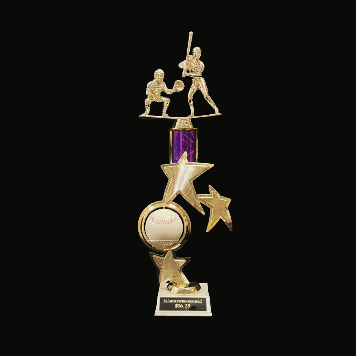 This trophy includes a baseball player figure, a 2” column, a 3x3 base, and a black/brass plate with three lines of customizable engraving.